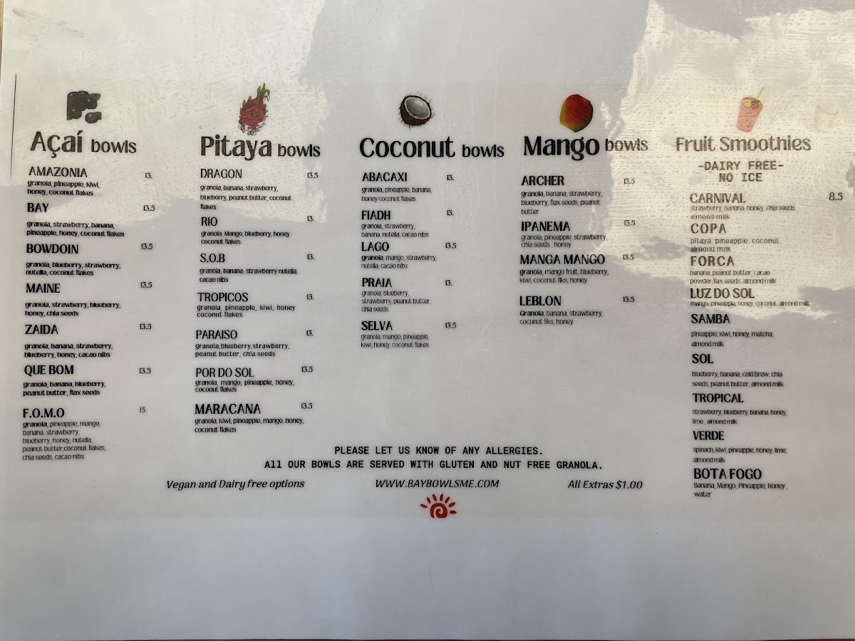The menu at Bay Bowls is centered around acai bowls, smoothie bowls, and a variety of toppings that cater to every taste preference. The star of the menu is undoubtedly the acai bowl, which is packed with vibrant, antioxidant-rich acai berries, layered with granola, fresh fruits, and drizzled with honey or nut butter for added flavor. Each bowl is customizable, so whether you prefer a tropical twist with mango and coconut or something a bit more indulgent with chocolate chips and peanut butter, there's an option for everyone.