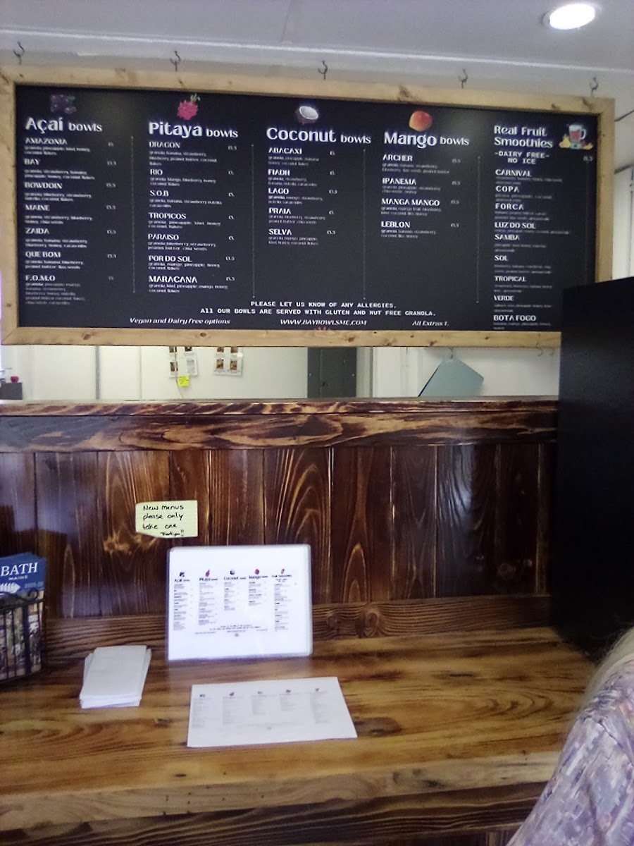 Pineapple, mango, banana, strawberry, blueberry, honey, Nutella, peanut butter, coconut flakes, chia seeds, cacao nibs.